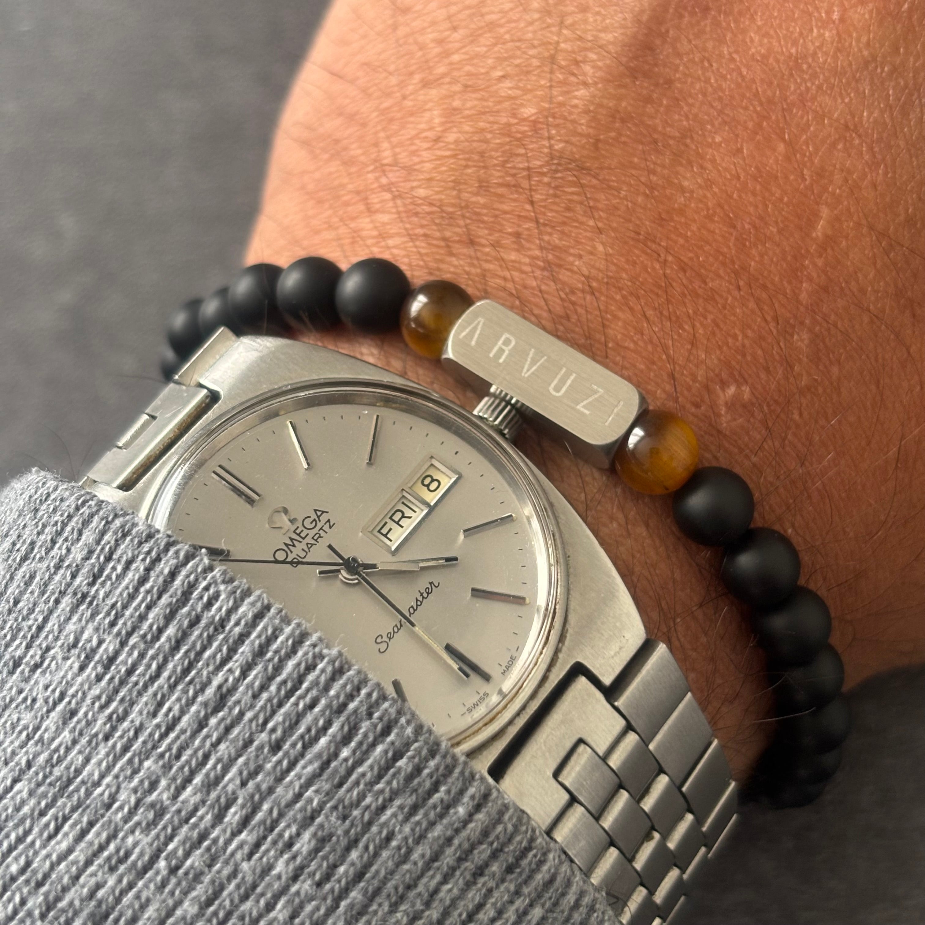 Built for presence and precision, Onyx Instinct features matte black onyx beads for grounding and golden tiger’s eye for bold intuition. Known as the “stone of courage,” tiger’s eye brings clarity in decision-making. Finished with a brushed stainless steel Arvuzi tag, this bracelet is a daily reminder to trust your gut and move with purpose.